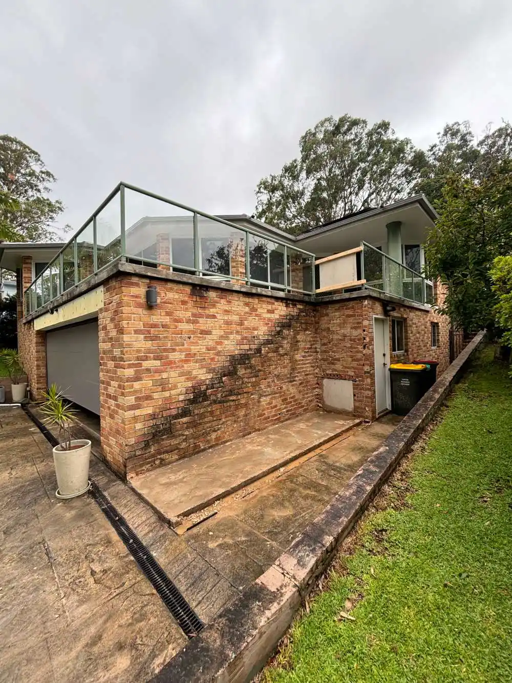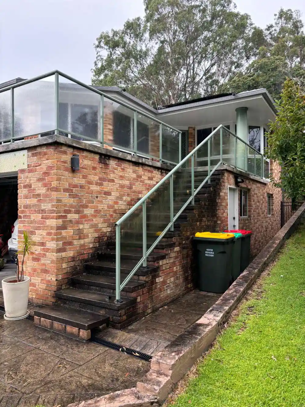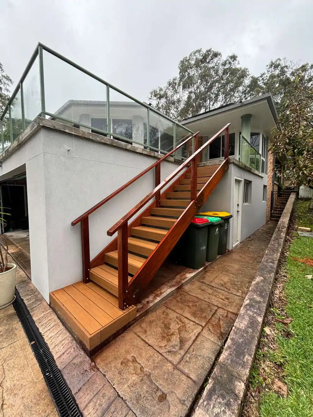 Demolition of old, out dated and out of building code brick stair case, replaced with Merbau stringers and ekodeck composite decked treads to give a floating step effect