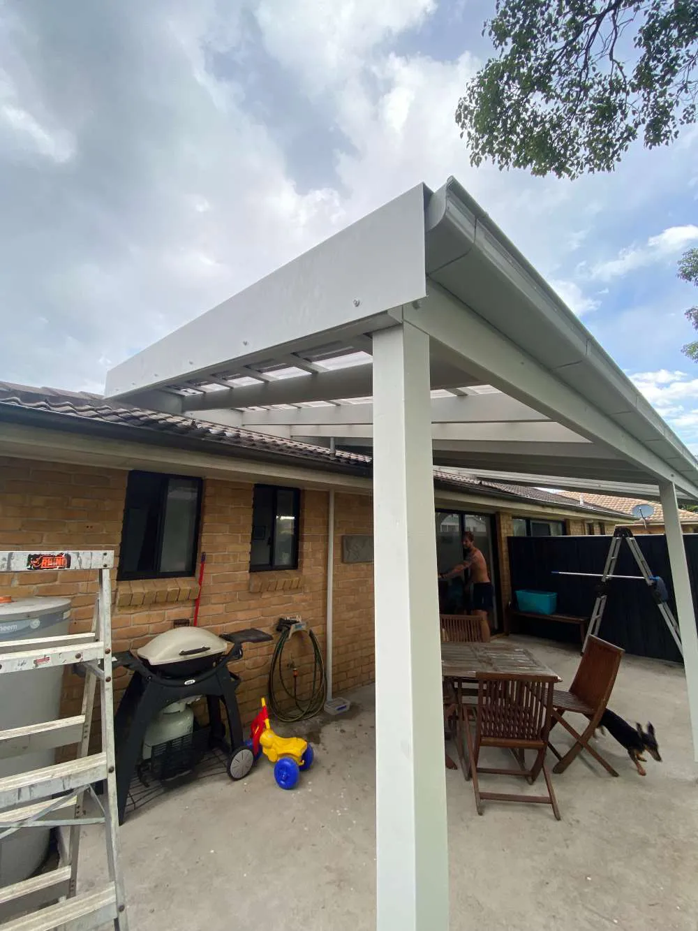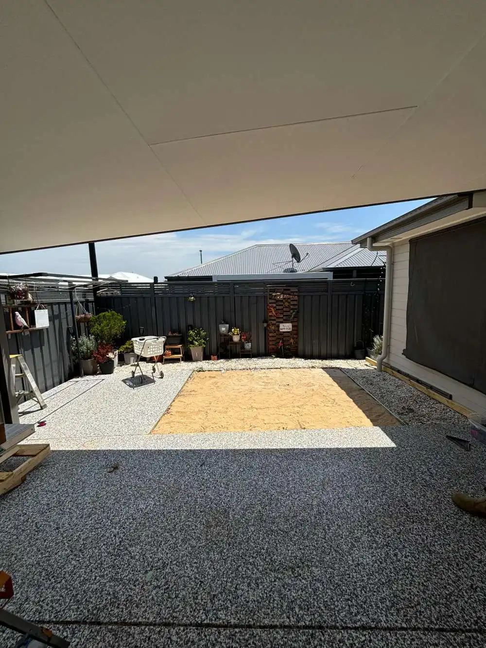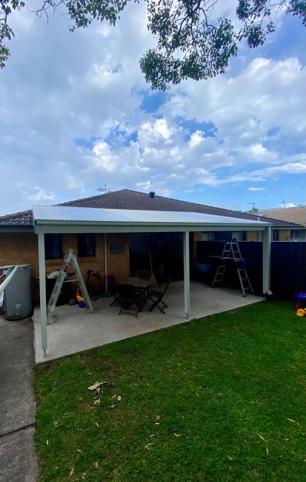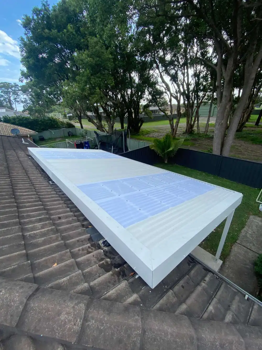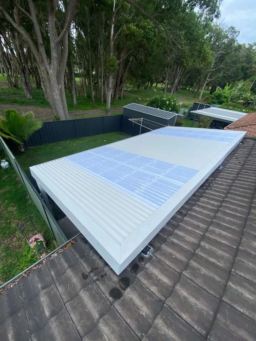 Fly over pergola in anna bay, corrugated surfmist sheeting broken up by some frosted polycarbonate sheets to let some light into the area