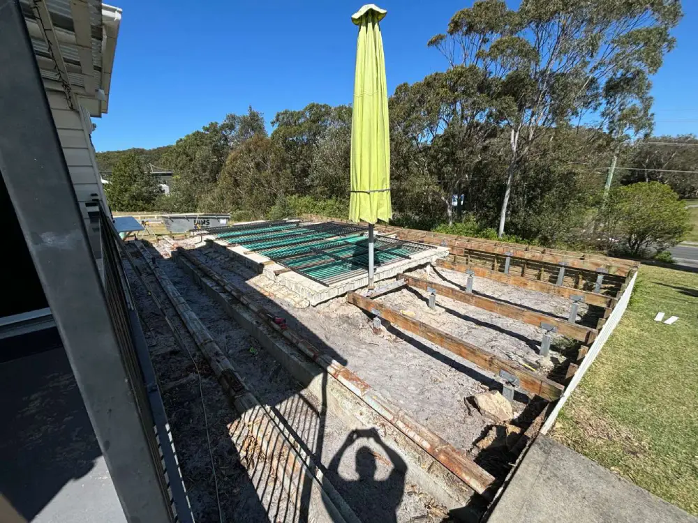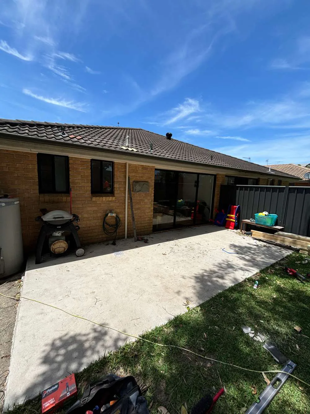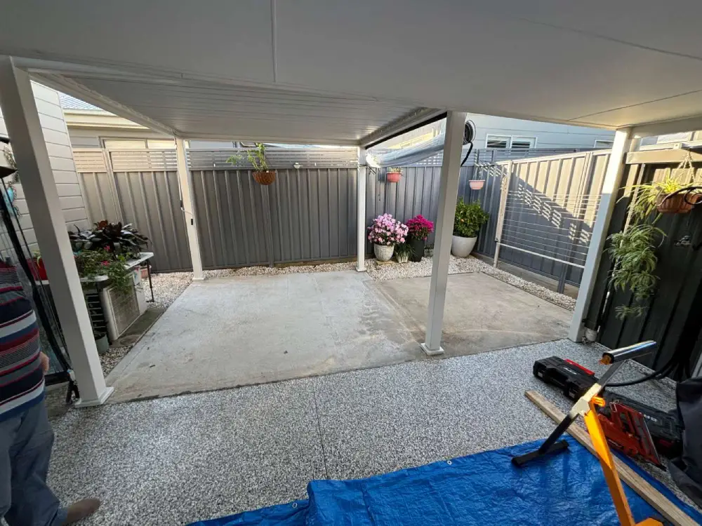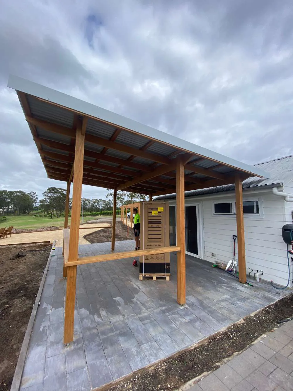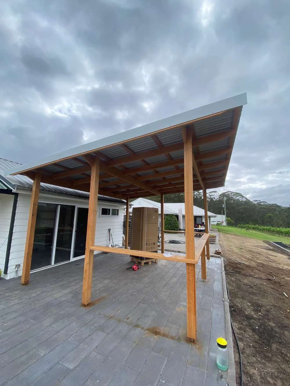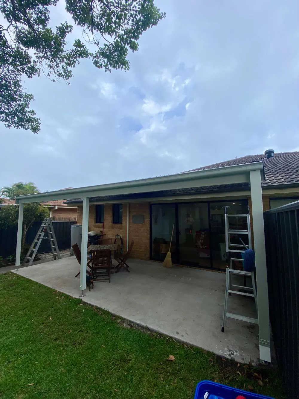 Fly over pergola in anna bay, corrugated surfmist sheeting broken up by some frosted polycarbonate sheets to let some light into the area