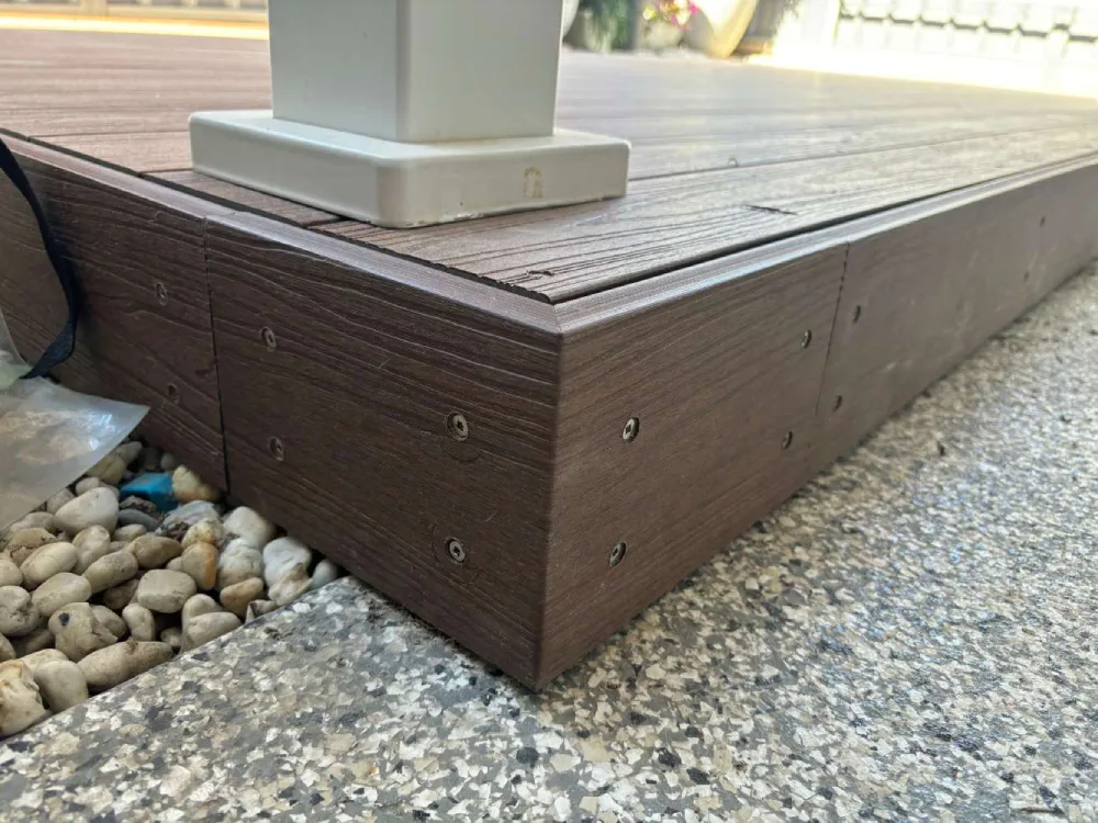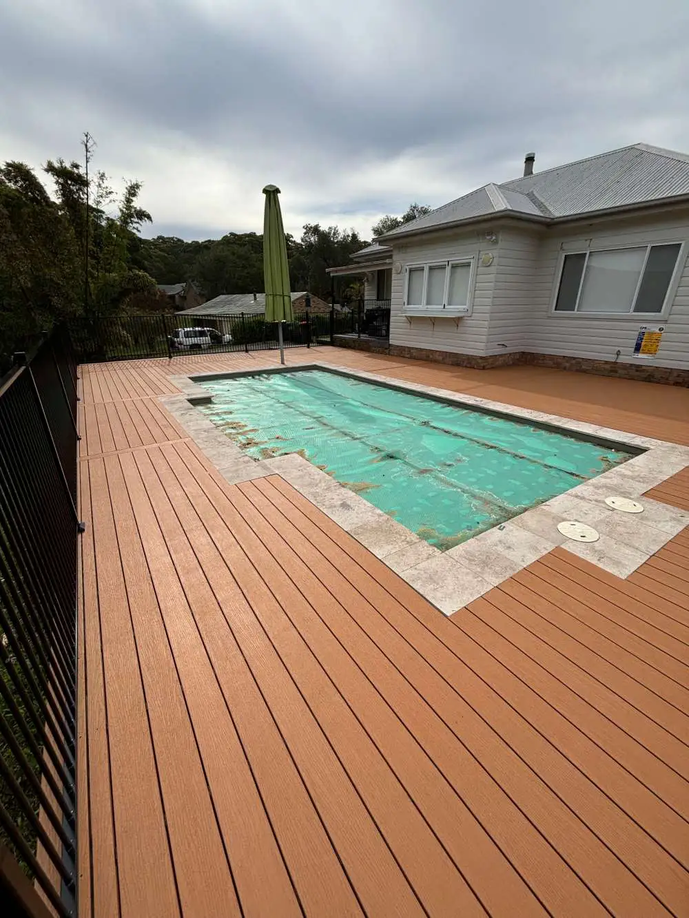 Large pool deck in boat harbour, decked with modwood composite decking in goldensand colour, cliplock system for minimal screws and a clean finish